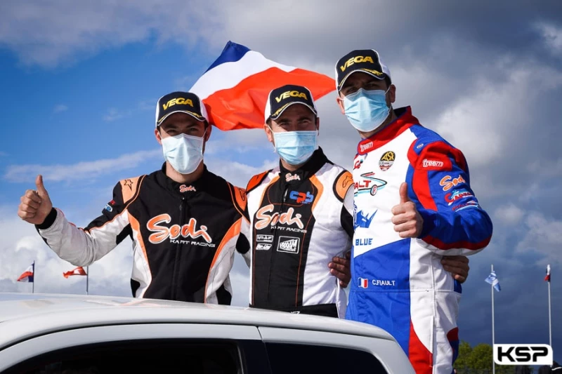 Le soleil accompagnait le départ de la 3e finale du Championnat de France KZ2 Master. A l’extinction des feux, Yoann Sanchez (Sodi/TM) conservait sa 1re place suivi par Julien Guéant (CRG/TM), Antoine Poulain (Sodi/TM) pointant 3e. Guéant rétrogradait sévèrement au tour suivant et on retrouvait Sanchez, Poulain et Charles Fiault (Sodi/TM) en lutte pour la victoire. Emilien Grosso (Alpha/TM) venait rapidement les rejoindre au sein d’un quatuor endiablé, David Léglise (Birel ART/TM), 5e étant à plus d’une seconde. Poulain attaquait ensuite Sanchez et tentait de prendre une légère avance sur ses trois compères. Après la mi-course, Grosso s’emparait de la 3e place de Fiault. Le groupe de tête s’étirait légèrement, entre 3et 4 dixièmes séparant en moyenne les quatre fantastiques. Pendant ce temps Jean-Philippe Ligier (Redspeed/TM) s’était installé en 6e position. Poulain continuait à attaquer pour assurer sa victoire. Il remportait la course 7 dixièmes devant Grosso, passé second dans les derniers instants, 18 millièmes devant Sanchez qui devenait cependant Champion de France. Fiault finissait 4e et Ligier 5e quatre secondes plus loin.