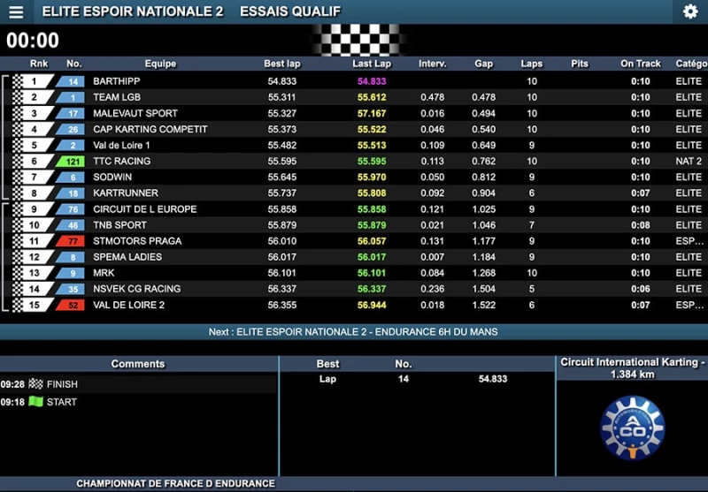 Les chronos progressaient jusqu’au terme de la séance de 10 minutes. En Élite, le n°14 BartHipp – Kart Runner (Exprit/Rotax) de Micah Barthélémy et Noa Hipp ne cessait d’améliorer en tête pour finir sur un dernier tour en 54’’833 synonyme de pole position 0,478’’ devant le n°1 Team LGB Kart Runner (Tony Kart/Rotax) d’Arnaud Bouillant, Bruce Lorgère-Roux, Maxime Bidart et Vincent Jean-Baptiste qui devançait finalement le n°17 NPS – Malevaut Sport (Tony Kart/Rotax) de Clément Bentejac, Vivien Cussac-Picot, Quentin Aunis et Nicolas Picot de 16 millièmes.