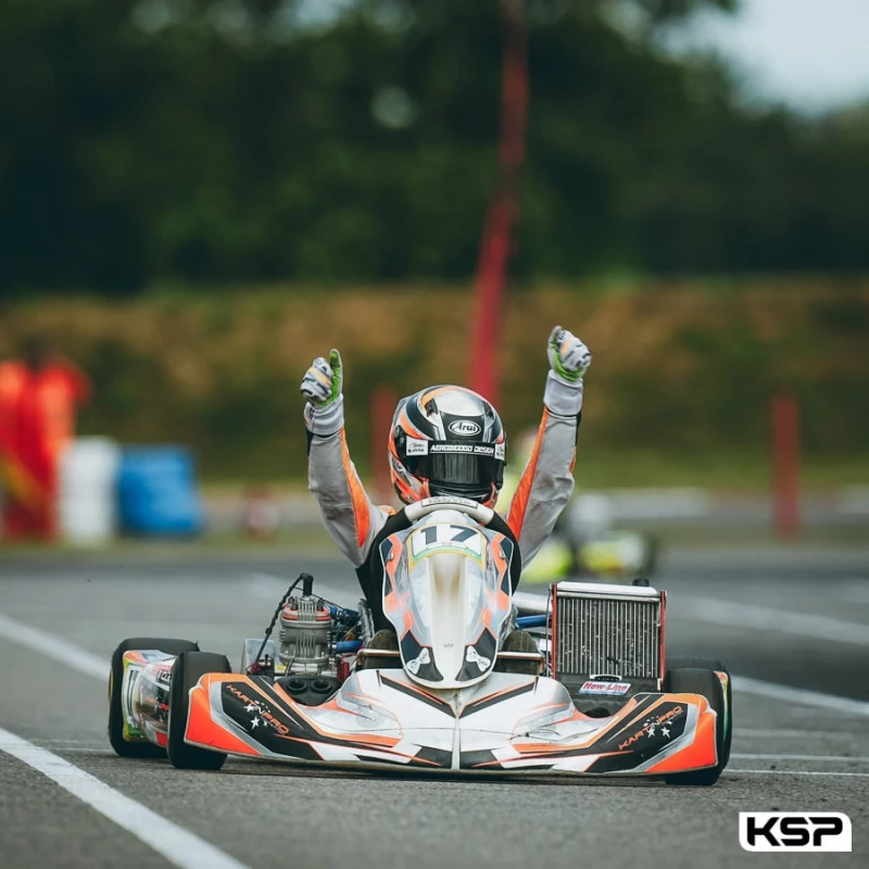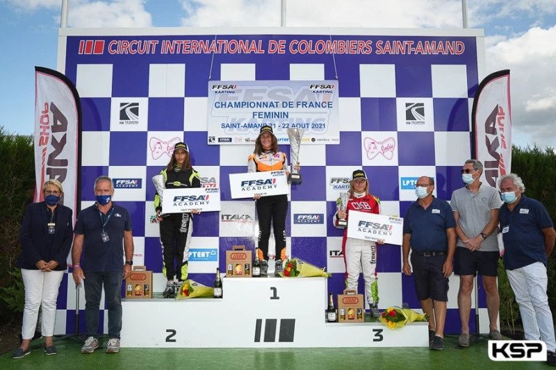 Lors de la finale de Saint-Amand du Championnat de France Féminin, Luna Cléret (Exprit/Iame) bouclait de nouveau le 1er tour en tête 4 dixièmes devant Royanne Hamidat Sodez (Kosmic/Iame). Chloé Cannard (Redspeed/Iame) passait 3e devant Tania Cirelli (Exprit/Iame) et Lydie Valichon (FA Kart/Iame) alors que Léonie Claude (Tony Kart/Rotax) chutait au 11e rang. Cléret ne tardait pas à prendre le large à coup de meilleurs tours et c’est la bataille pour la 3e place qui retenait l’attention. Revenue rapidement 6e, Alexandra Hervé (Tony Kart/Iame) se joignait à un groupe en pleine bagarre en compagnie de Mathilde Habrant (DR/Rotax). Celle-ci se hissait à la 6e position tandis que dame Claude remontait au 7e rang. Peu après la moitié des 29 tours, Cléret possédait une avance confortable de 2,6’’ sur Hamidat Sodez. 3e, Cannard résistait à la pression de Cirelli et Valichon, Claude pointait en 6e position à quelques longueurs. Léonie dépassait Lydie à 5 tours de l’arrivée pour atteindre la 4e place alors que Tania avait perdu plusieurs places. Cléret signait une nouvelle victoire synonyme de titre de Championne de France 2,5’’ devant Hamidat Sodez. Cannard conservait sa 3e place, Claude finissait 4e avec le meilleur tour en course au terme d’une remontée de 7 positions. Valichon était 5e devant Hervé et Cirelli.