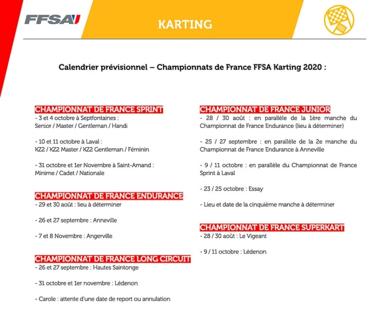 La FFSA a joint à son dernier communiqué du 17 avril 2020 une visualisation de son calendrier prévisionnel par championnat.