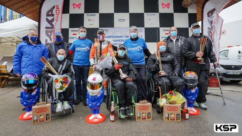 Changement de décor dimanche après-midi avec l’arrivée de la pluie pour la finale du Championnat de France Handikart à Septfontaine. Laurent Flamant (Exprit/Rotax) prenait tout de suite le sillage de Maxime Léger (Kosmic/Rotax) à l’extinction des feux, mais c’est la performance de Juan Lascorz Moreno (CRG/Iame), pilote H4, qui retenait l’attention en passant rapidement 2e devant Flamant. Omar Megari (Sodi/Iame) revenait ensuite en 3e position. Autre pilote H4, Vianney Chan Tsin (Kosmic/Rotax) accédait à une incroyable 5e place devant Nicolas Chevesson (JB17/Iame). Par contre, Mickaël Vacher (Sodi/Rotax) était à la peine en 10e position. Megari sortait de la piste en tentant de revenir sur Lascorz Moreno et chutait 10e. Léger remportait un nouveau titre de Champion de France Handikart tandis que Lascorz Moreno prenait la 1re place H4 à moins de 8’’ du vainqueur, un exploit à signaler. Flamant prenait la 3e place, suivi à une formidable 4e place par Chan Tsin, 2e H4, Olivier Boudin (Exprit/Rotax) terminant 5e.