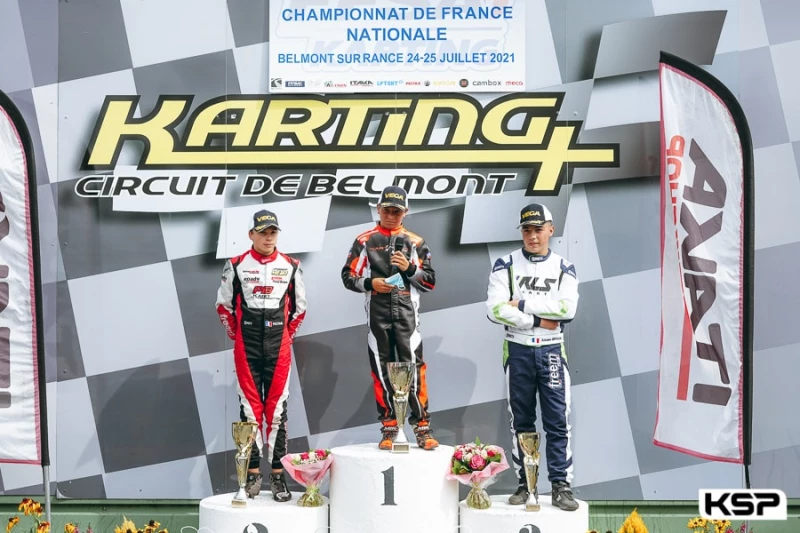 La finale Nationale du Championnat de France de Belmont-sur-Rance s’élançait sous un temps printanier. Pacôme Weisenburger (Kosmic) était tout de suite suivi par Louis Iglesias (Exprit) et Antoine Broggio (KR) qui passait ensuite 2e alors qu’Enzo Lacreuse (Redspeed) pointait 4e devant Téo Blin (Tony Kart). Pablo Sarrazin (Kosmic) et Valentin Hervas (Redspedd) avaient dévissé au classement. Le trio de tête avait rapidement creusé un écart de plus d’une seconde avec ses poursuivants, eux-mêmes de plus en plus éparpillés.