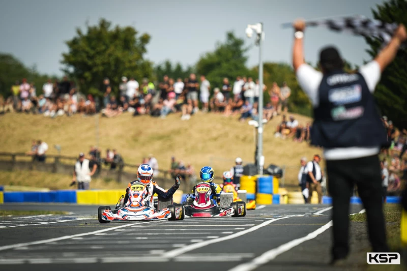 Xavier Dias (KR/Iame) prenait l’avantage sur Diego Pelassy (Redspeed/Iame) dans le 1er tour de la finale 3 Sénior de la Coupe de France d’Angerville. Léo Poncel (KR/Iame) prenait ensuite les commandes suivi par Kevin Bejeannin (Kosmic/Iame). Eliott Soubirou (KR/Iame) avait renoncé. Paul Alberto (KR/Iame) avait repris 19 places au 12e rang en 5 tours. Poncel et Bejeanin étaient au coude-à-coude, Maxime Geley (Sodi/Iame) pointait 3e à 6 dixièmes devant Dias et Pelassy en lutte pour la Coupe. Alberto rentrait dans le top 10 avec un top 5 au classement en ligne de mire. Malo Bolliet (KR/Iame) pointait 11e avec un gain de 19 places. La course se poursuivait sans grand changement aux avant-postes. Poncel s’imposait finalement 2 dixièmes devant Bejeannin, puis Geley 3e, Dias 4e et Pelassy 5e qui sauvait ainsi la 1re place de la Coupe. Alberto terminait 7e (+24 pl) avec le meilleur tour, Bolliet 20e (+20 pl). Des pénalités venaient changer la donne après la course. Dias (départ) reculait au 12e rang devant Pelassy (collision). Alberto se retrouvait 4e (+27 pl) devant Amaury De Gramont (Redspeed/Iame), Ethan Pharamond (Kosmic/Iame) 6e et Bolliet 7e (+23 pl).