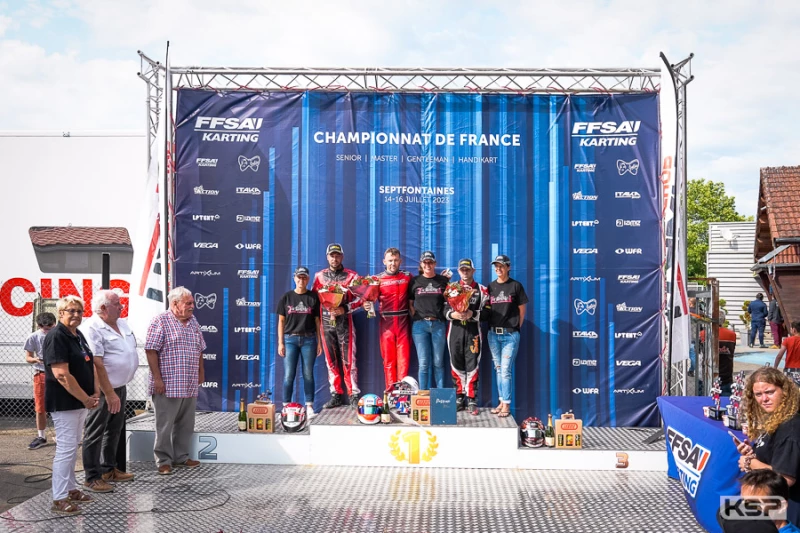 Le ciel avait viré au bleu pour le départ de la finale Master-Gentleman du Championnat de France à Septfontaine. David Chenillot (G-Redspeed/Iame) menait dès le départ, Guillaume Barbarin (M-KR/Iame) passait en 2e position dans le 1er tour face à Laurent Marchandise (M-Redspeed/Iame) qui répliquait. La lutte entre ces deux pilotes tournait à l’avantage de Barbarin, Thomas Jacquemin (M-Sodi/Iame) passait 3e devant Marchandise. Chenillot en avait profiter pour accroître son avance au-delà d’une seconde. Marchandise revenait 3e, et attaquait à nouveau Barbarin. Ludovic François (G- Tony Kart/Iame) retrouvait la 5e position devant Ludovic Ivanes (G-OTK/Iame). Les positions changeait à chaque tour entre Marchandise et Barbarin. Au premier tiers de la course, Chenillot était pointé plus de 2 secondes devant le duo endiablé et contginuait à enchainer les meilleurs tours. Plus loin, Michael Girardet (M-Sodi/Iame) avait progressé de 6 places au 7e rang. Les tours se suivaient sur la riante colline. Chenillot remportait la course avec le meilleur tour et devenait Champion de France Gentlmeman, 3,6’’ devant Marchandise, nouveau Champion de France Master. Barbarin a tenté jusqu’au bout de dépasser Marchandise, mais le décalage entre ses points forts sur la piste et ceux de son rival ont anéanti son objectif. Jacquemin terminait 4e à plus de 3’’ devant François.